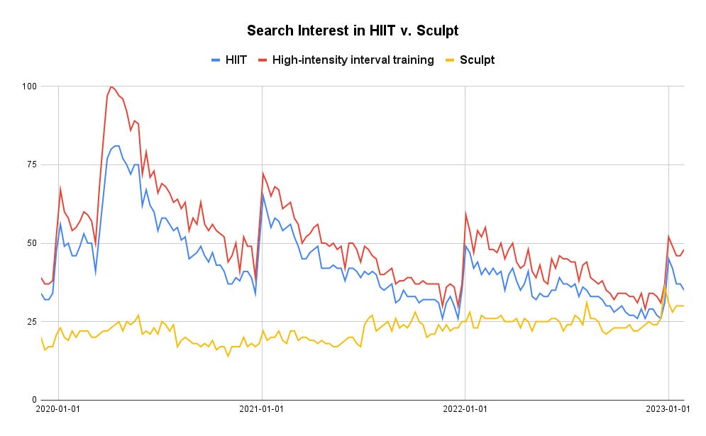 The blue and the red lines are search interest in “HIIT” and “High-intensity interval training” respectively, while the yellow line is search interest in “Sculpt.” You can see that interest in HIIT peaked during the pandemic, which makes sense, given we were all looking for some stress relief at that time.